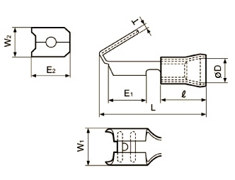 | Partnumber | Wire size | AWG | Colour | L | E | Ø D | l | T | Mat. thickn. | W |