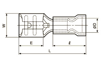 | Partnumber | Wire size | AWG | Colour | L | E | Ø D | l | Mat. thickn. | Tab thickn. | W |