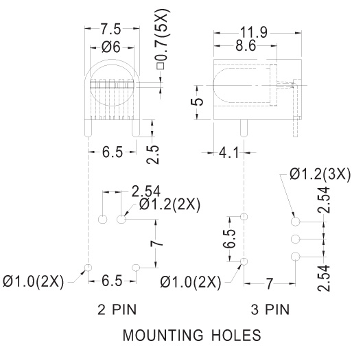 Round LED spacer 90 degrees, Ø5 mm LED, 2 or 3 pin